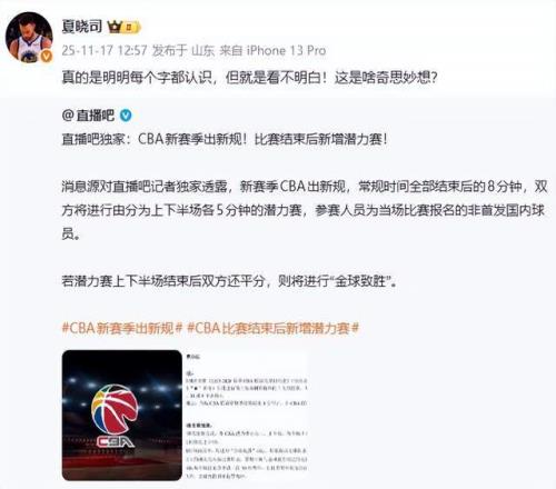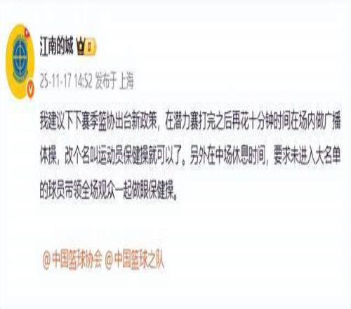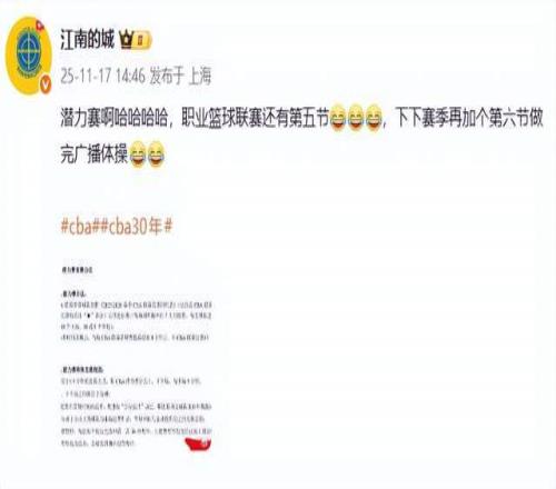 “江南的城”老师则连发2条动态,表达了自己的质疑,“潜力赛啊哈哈哈哈,职业篮球联赛还有第五节,下下赛季再加个第六节做完广播体操。”