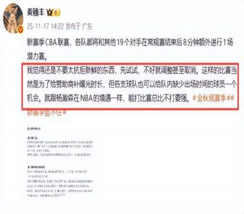 广东媒体人麦穗丰老师则表示,“我觉得还是不要太抗拒新鲜的东西,先试试,不好就调整甚至取消。这样的比赛当然是为了给赞助商补曝光时长,但各支球队也可以给队内缺少出场时间的球员一个机会。就跟杨瀚森在NBA的境遇一样,能打比赛总比不打要强。”