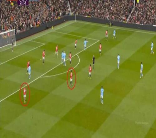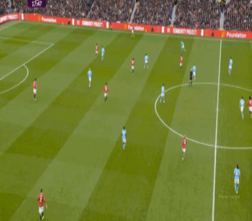 这也使得曼联在开场只有2分钟的时候,就用两次长球直打,直接进入了曼城的禁区线空间内: