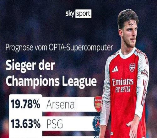 Opta预测欧冠夺冠概率前5:阿森纳第1,巴黎第2,曼城第3 -