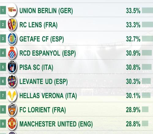 五大联赛转换阶段进攻占比:柏林联合最高,曼联排名第九 -