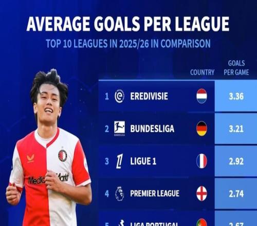 欧洲前10联赛场均进球:荷甲3.36球第1,意甲2.22球垫底 -